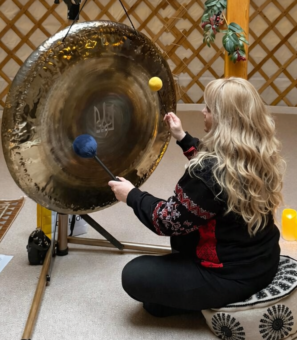 I use different types of gongs ( the "Aura" 28 inch, the gong "Ukrainian Heart" 36 inch, the gong "Vento" 20 inch, Grotta Sonora "Cosmos", Shamanic drum 24 inch, Tibetan singing bowls, crystal bowls, and other healing instruments.